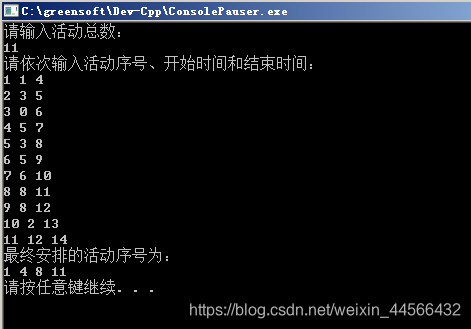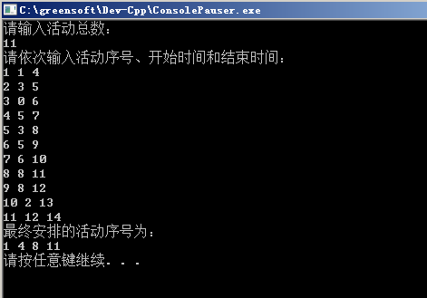 cout << "请依次输入活动序号、开始时间和结束时间:" << endl;