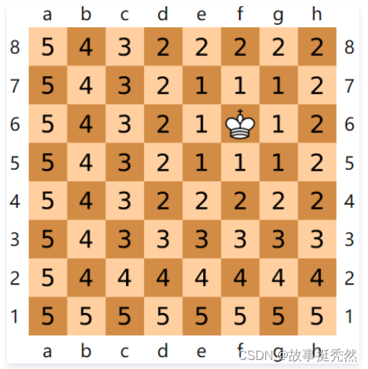 示例:在国际象棋中,王的走法为可以横、竖、斜三个方向走动,但每次只能走一步。以下图为例,处于f6处的王到棋盘上各点所需要的最少步数即为该点到其他点的切比雪夫距离。因此切比雪夫距离又称棋盘距离。(如下图)