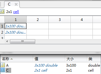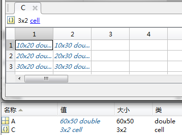 C = mat2cell(A,[10,20,30],[20,30]); % C = mat2cell(A,dim1Dist,dim2Dist)产生的元胞结构如图,相当于 dim1 和 dim2 的排列组合
