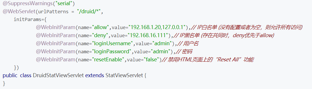 @WebInitParam(name="exclusions",value="*.js,*.gif,*.jpg,*.bmp,*.png,*.css,*.ico,/druid/*")// 忽略资源