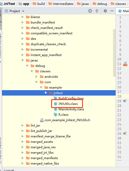 javah -jni -cp . com.example.jnitest.JNIUtils执行命令成功后,即可得到.h文件,如上图所示:com_example_jnitest_JNIUtils.h文件,其内容如下: