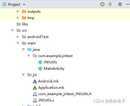#endif第五步:得到头文件后,就可以根据.h文件,实现对应的C代码。在java目录下,新建一个jni文件夹,将生产的.h文件拷贝到这个目录下,然后新建一个名为JNIUtils的C文件,在该代码中实现头文件声明的函数,代码实现如下: