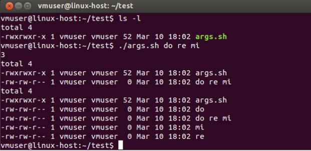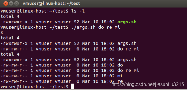 词,故每个参数都作为文件名创建了一个独立文件。在脚本中使用了 ls –l 命令列目录来验证
