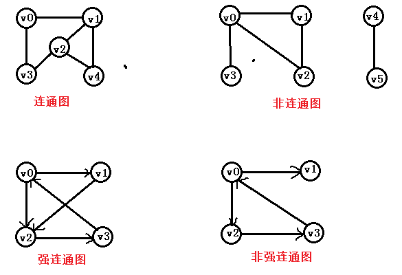 6) 连通图(强连通图): 在无(有)向图G={V,{E}}中,若对任何两个顶点v、u都存在从v、u的路径,则称G是连通图(强连通图)