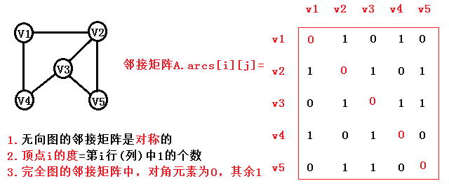 顶点表Vexs[n] i 0 1 2 ... n-1 Vexs[i] V1 V2 V3 ... Vn * 图的邻接矩阵是一个二维数组A.arc[n][n],定义为: