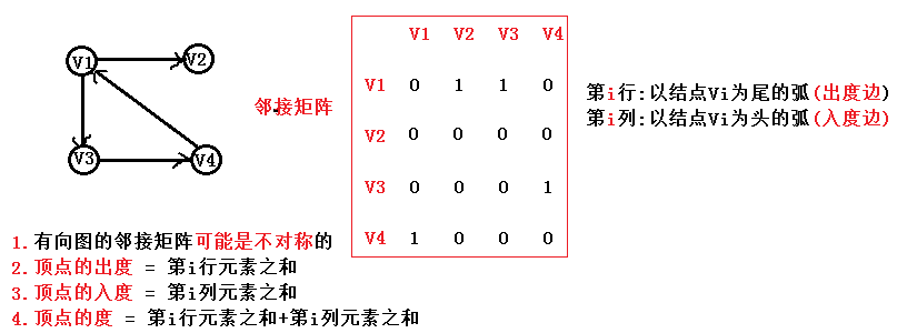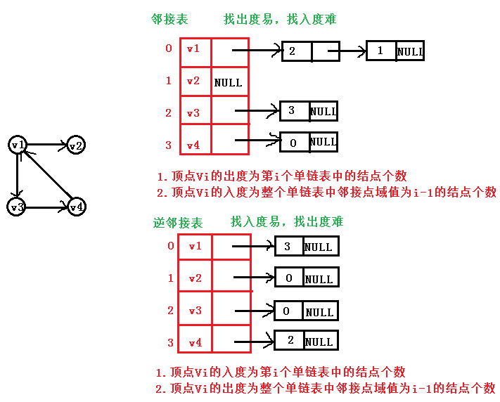 4) 对有向图来说:只能计算"出度";需要构造"逆邻接表"(存指向自己的边)来方便计算"入度"