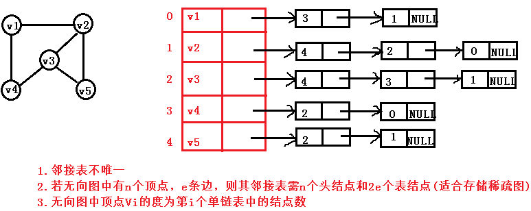 (1).对于任一确定的无向图,邻接矩阵是唯一的(行列号与顶点编号一致),但邻接表不唯一(链接次序与顶点编号无关)
