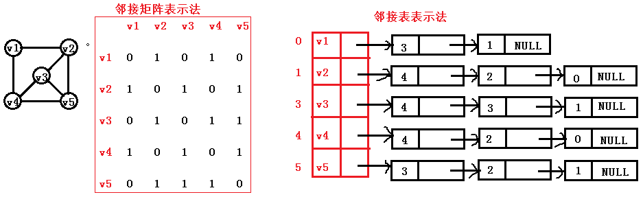 1)联系: 邻接表中每个链表对应邻接矩阵中的一行,链表中结点个数等于一行中非零元素的个数