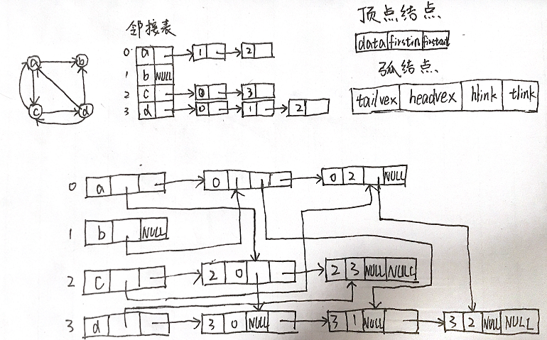 3) 有向图中的每个顶点在十字链表中对应有一个结点,叫作顶点结点