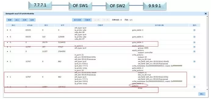 在本例中,OpenFlow交换机需要转发一个从7.7.7.1到9.9.9.1的流量。当流量上送到OpenFlow交换机后,流量的第一个包会先进行Packet-in、Flow-Mod、Packet out的过程,之后同流量的报文就能匹配控制器已经下发的流表进行转发了。