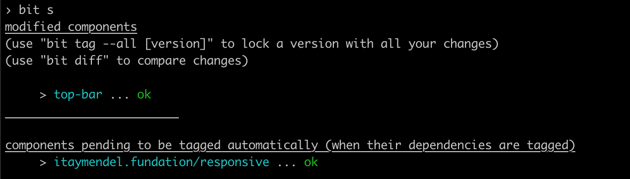 当您对存储库中的一个组件进行更改时,Bit将自动跟踪更改并识别将其用作依赖项的其他组件。 然后,如果您运行bit status ,则可以看到所有组件,因为它们的依赖关系已被修改,这些组件已被自动修改。