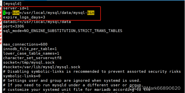 第二句是指定binlog日志文件的名字为mysql-bin,以及其存储路径