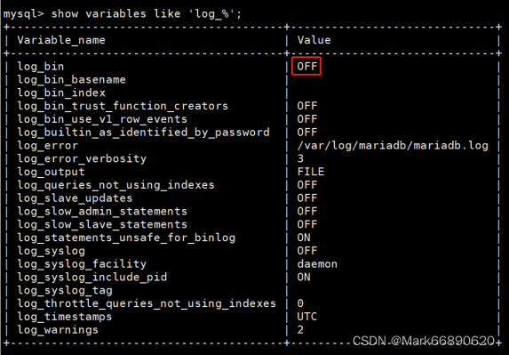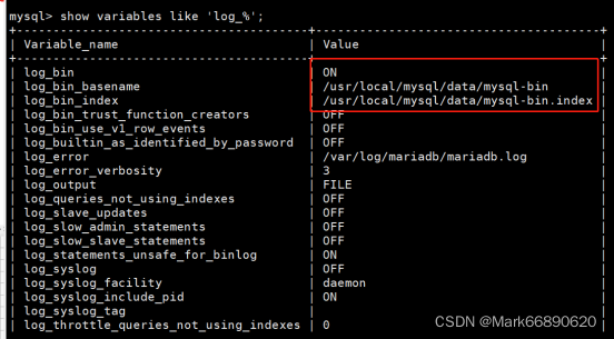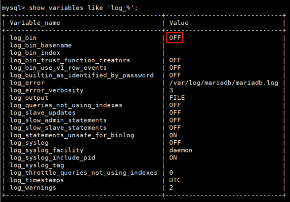 重复最上面第一步和第二步,登录mysql,并查看日志开启状态: