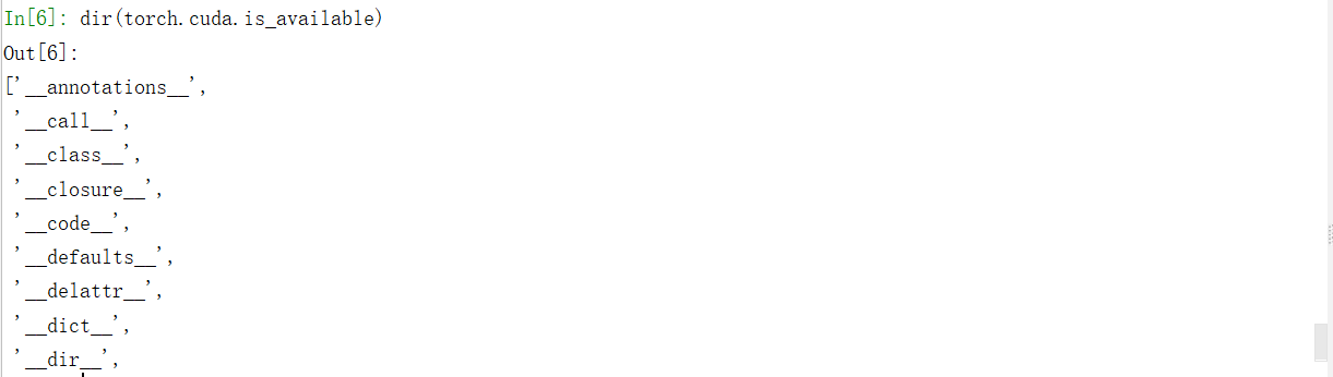 再输入:dir(torch.cuda.is_available),此时输出的函数格式为双下划线加函数名,这表明此时输出的为函数,而不是分隔区,不能继续分割,此时可使用help()方法查看函数的使用方法