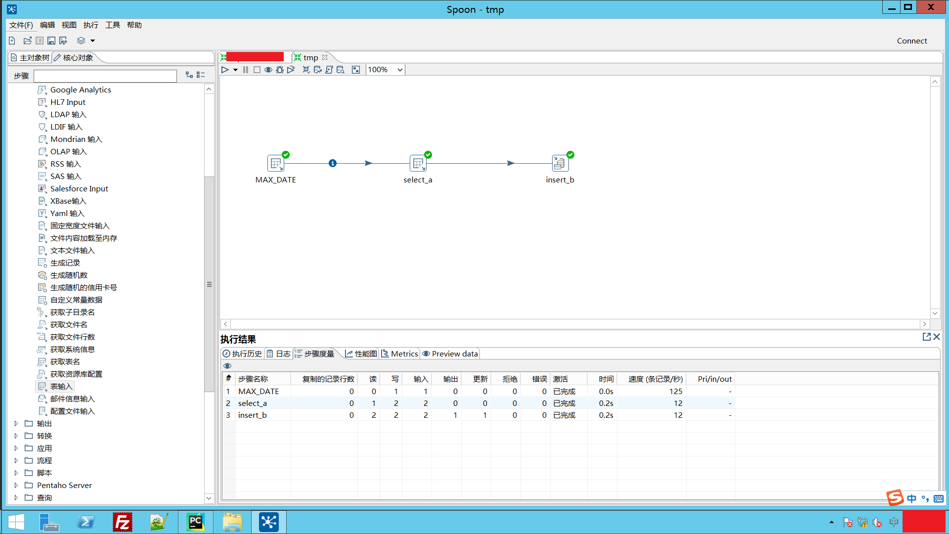 9)执行结果,如图三个步骤都有绿色对号,并且“步骤度量”表格中有相应的数值表示数据变动则说明增量更新成功。