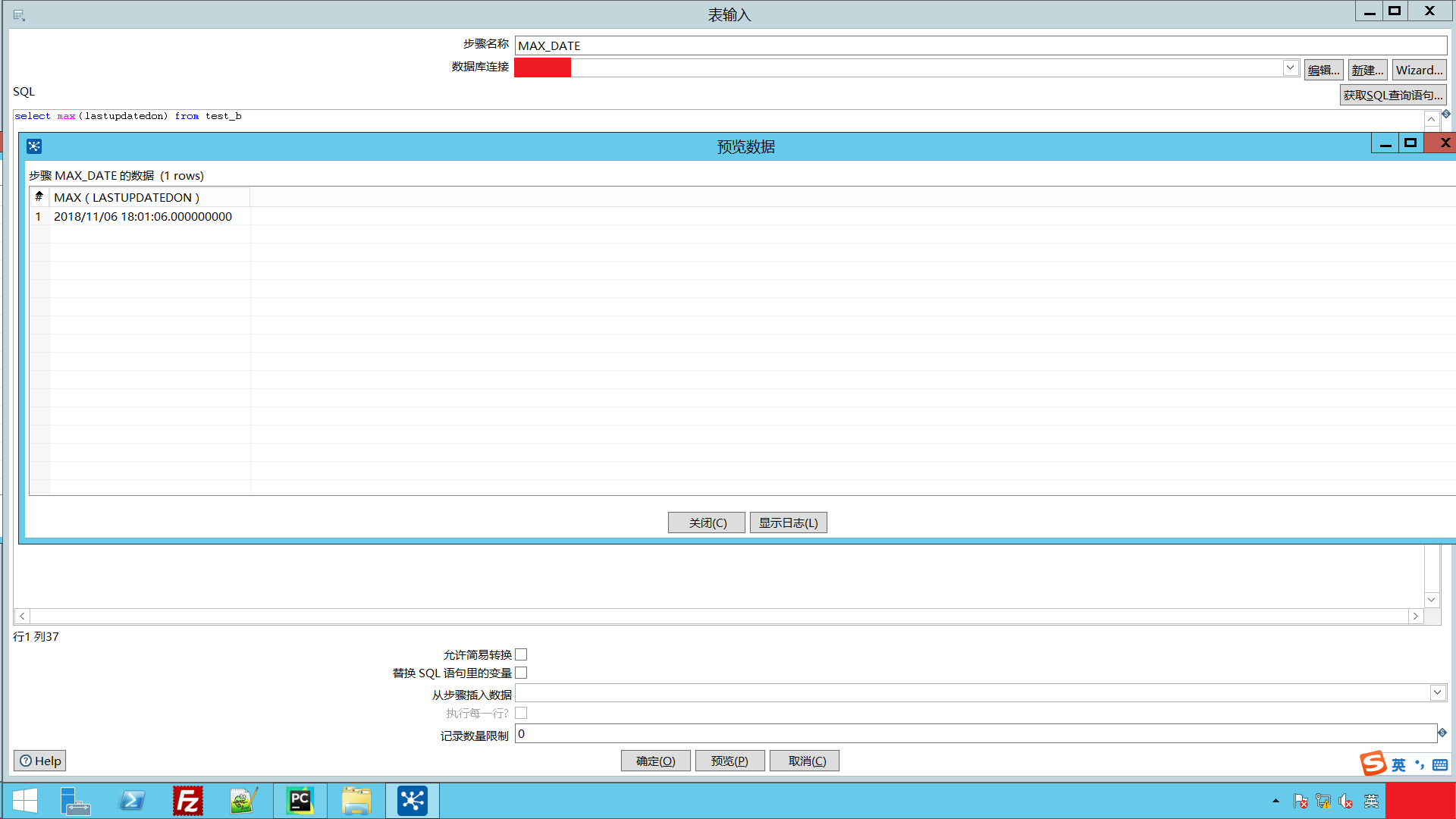 SELECT MAX(LASTUPDATEDON) FROM TEST_B其他配置默认,点击预览,看到类似下图数据表示这一步成功。然后点 “确定”。