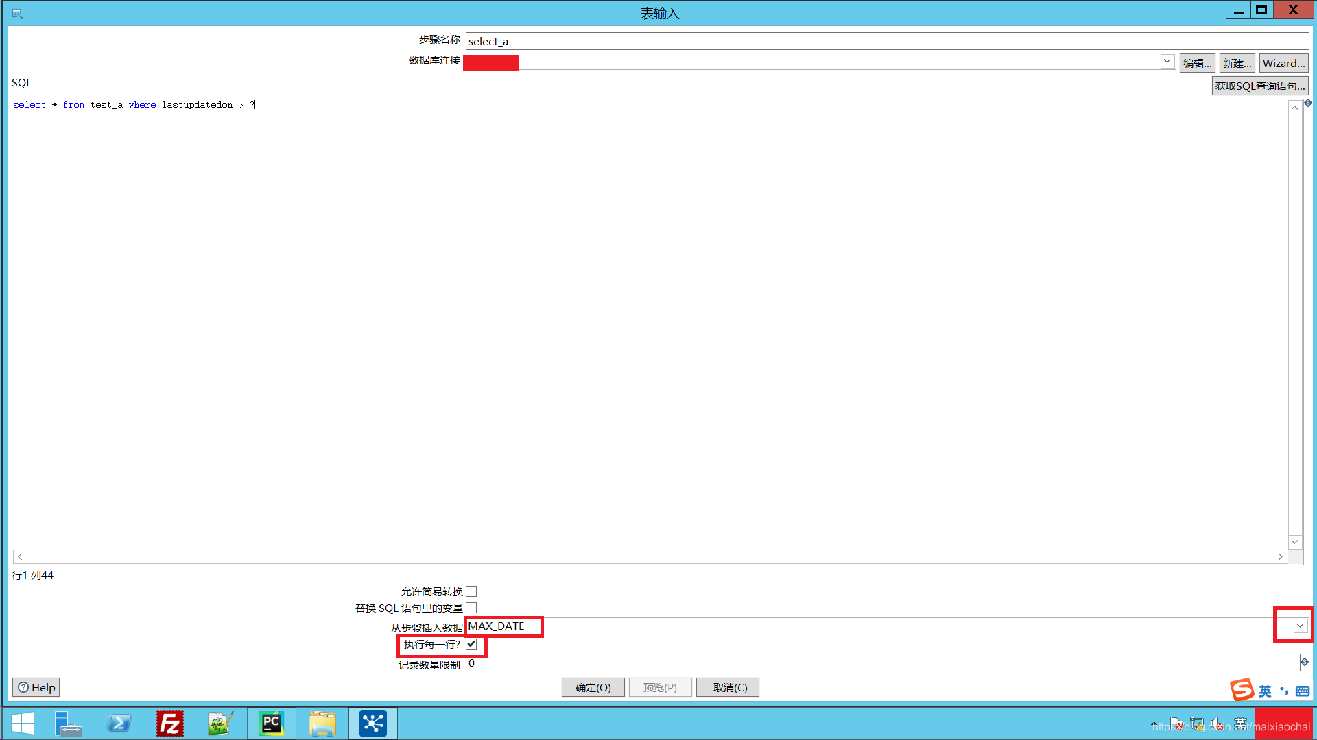 SELECT * FROM TEST_A WHERE LASTUPDATEDON > ?然后在“从步骤输入数据”中选择上一个步骤的名称,如此可将上一个步骤获取的最大时间作为问号位置的值,数据类型仍然为时间类型。