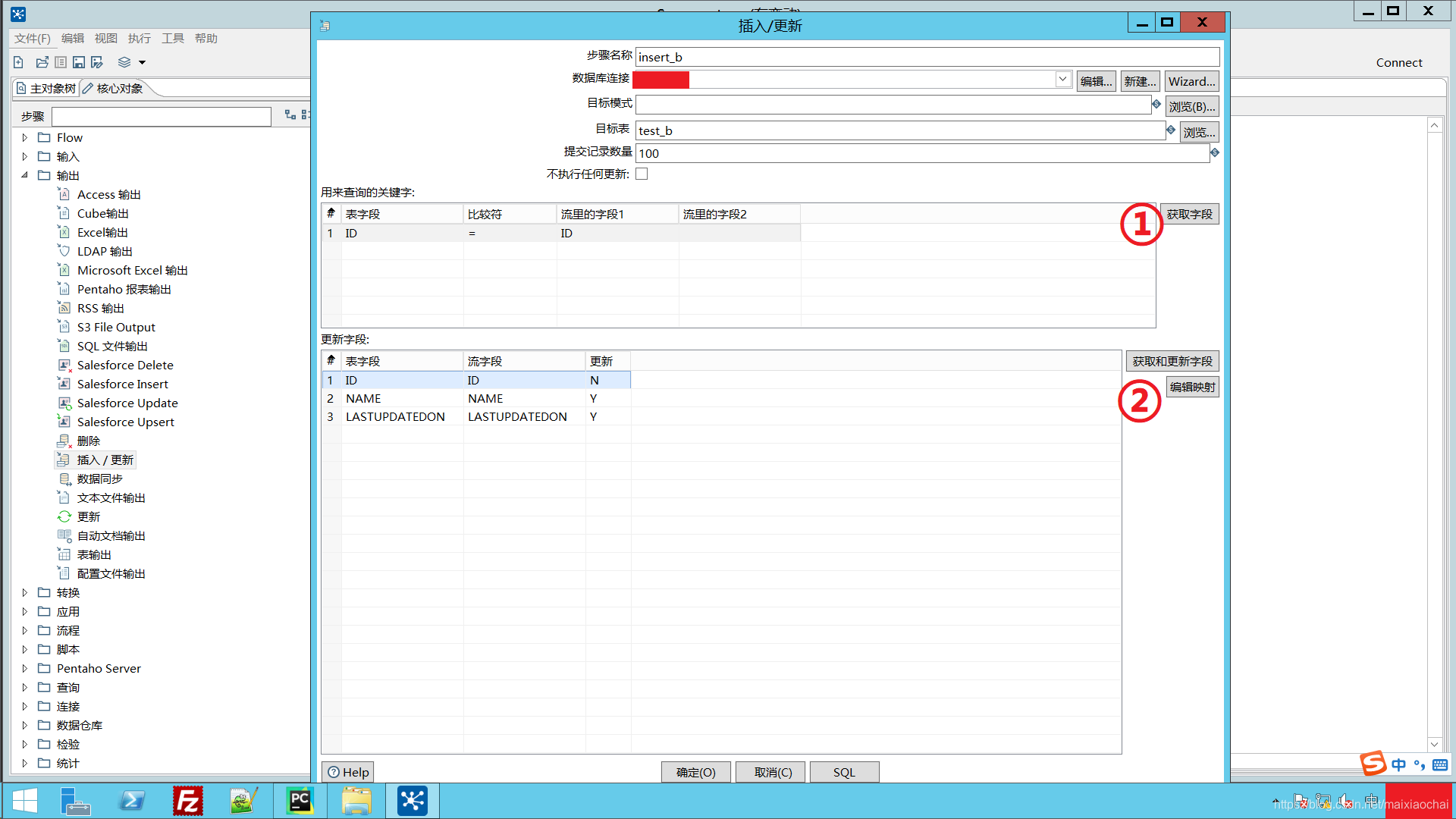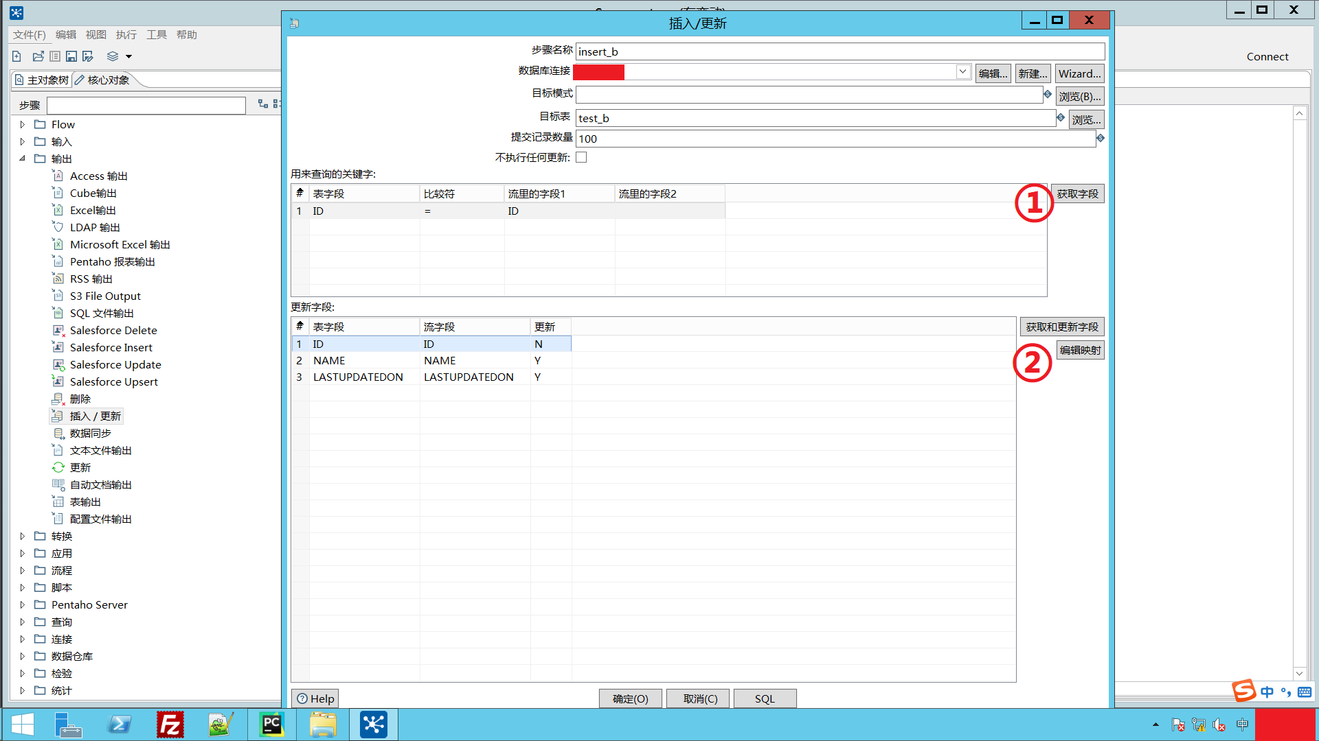1)如上图所示,需要两个表输入和一个插入/更新,并将三个步骤间的线连接好。