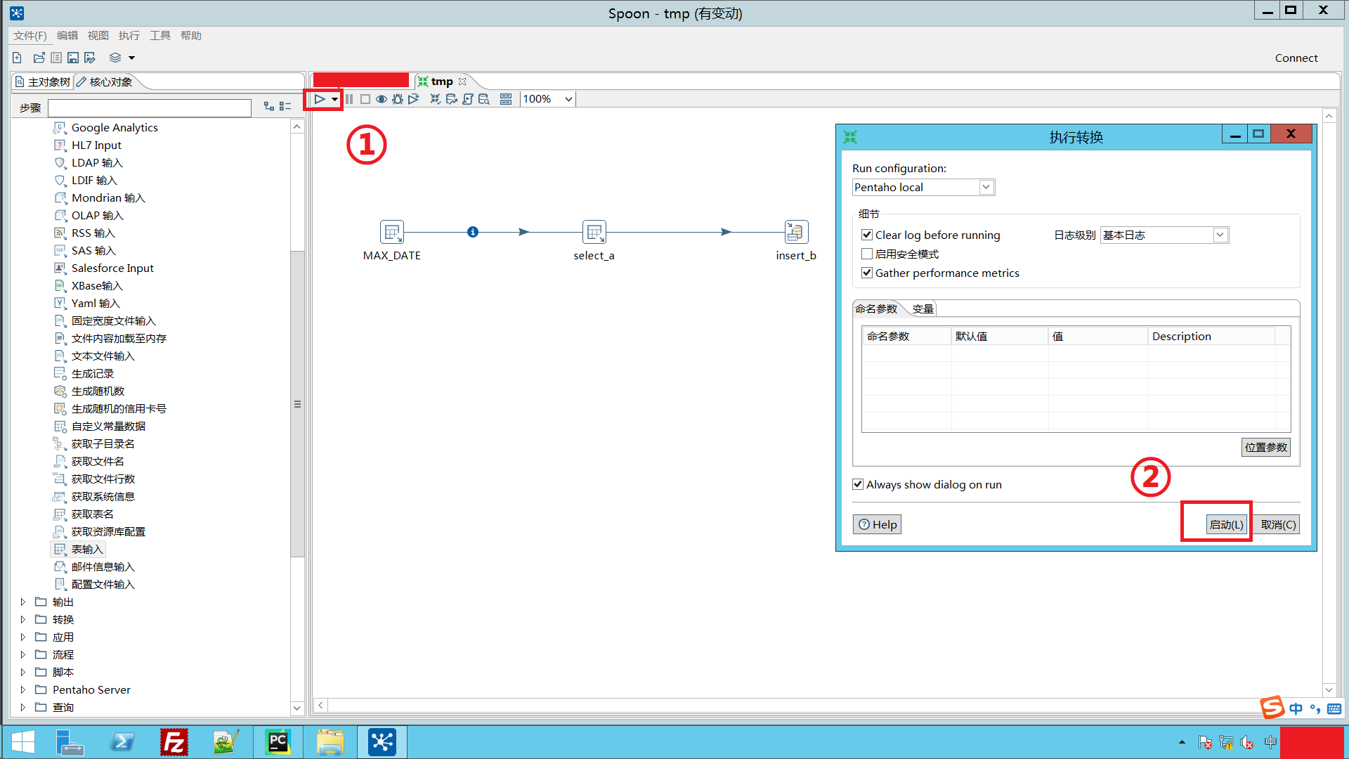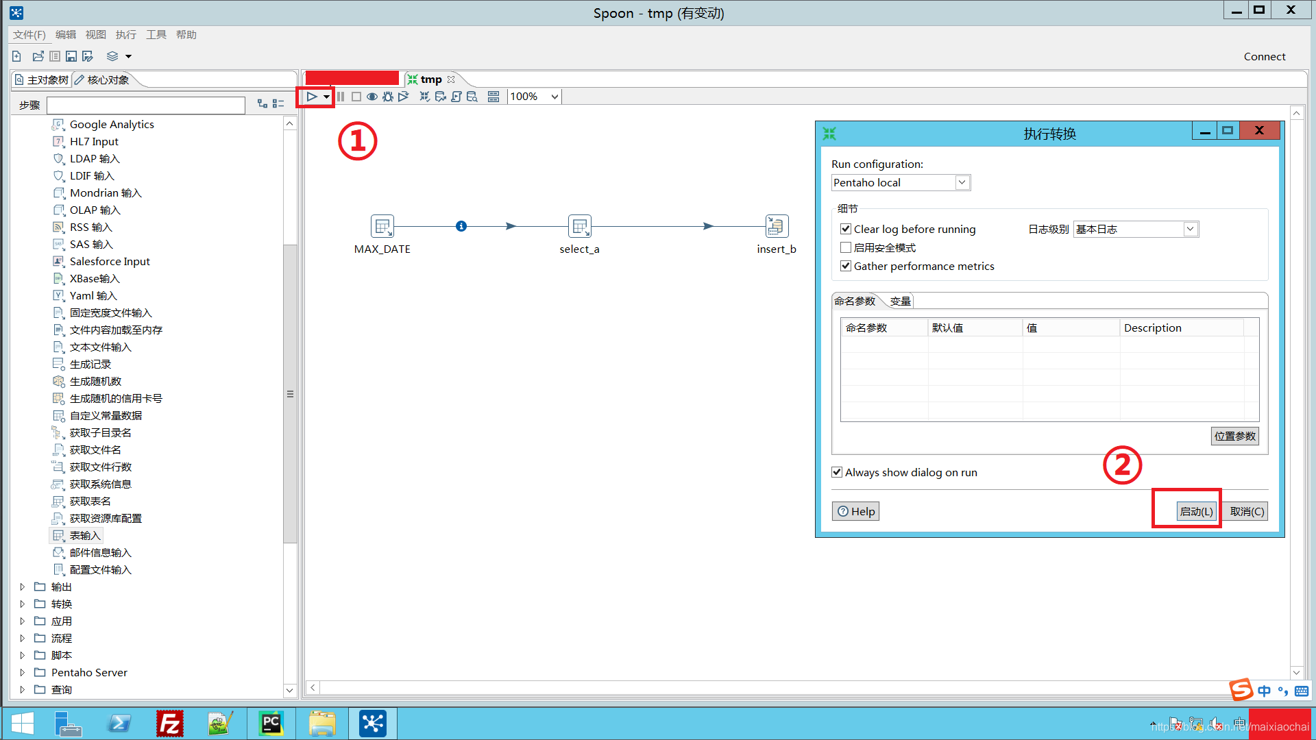 8)一切设置好之后,点击①的运行三角形,然后点击②的“启动”,执行增量同步。