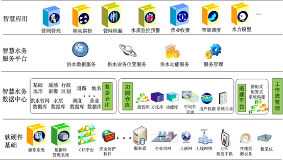 最上层为智慧应用包含管网管理、巡检、检漏、水力模型、水质监控预警、商务智能、智能调度等等。