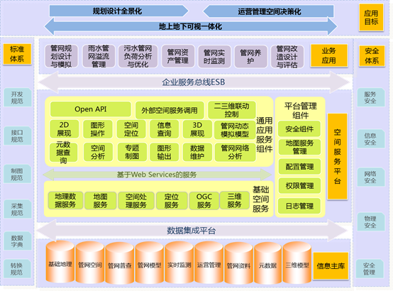 基础层主要包括系统建设所需要的软硬件设备,是系统建设的基础,包括操作系统、数据库管理系统、GIS平台、监测设备以及网络、服务器等软硬件设施。