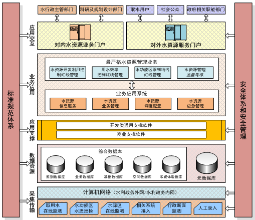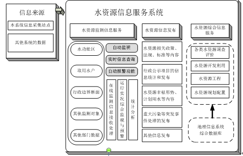 以支撑最严格的水资源管理业务为核心,充分依托水利信息化基础设施,以资源整合和信息共享为手段,建设以水源、取水、用水和排水等水资源开发利用主要环节的监测以及大江大河行政边界控制断面、水功能区监测为基础,以水利政务外网和政务内网为依托,以业务应用系统为重点的水资源管理系统,形成支持水资源管理体系的工作业务平台和决策支持环境,从而为各级水行政主管部门更好地履行水资源管理职责,实现水资源优化配置、高效利用和科学保护目标提供支撑。