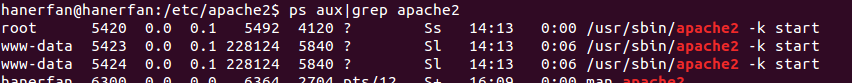 ps的结果显示,以root启动了一个进程(父进程,默认绑定80端口),以www-data用户启动了两个子进程(可以用ps -eLf观察到一大堆“线程”,图略):