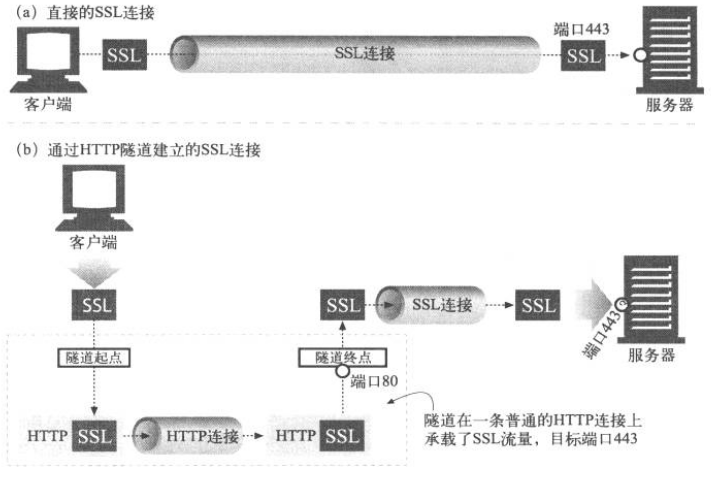 HTTP隧道的一种常见用途是通过HTTP连接承载加密的安全套接字层(SSL)流量,这样SSL流量就可以穿过只允许Web流量通过的防火墙了。如图,HTTP/SSL隧道收到一条HTTP请求,要求建立一条到目的地址和端口的输出连接,然后在HTTP信道上通过隧道传输加密的SSL流量,这样就可以将其盲转发到目的服务器上去了。