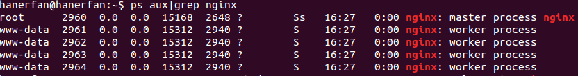 可见,nginx以root启动了master进程(其PID写在/run/nginx.pid),以www-data启动了4个worker进程。另外,master进程在80端口上监听。这些配置可以在/etc/nginx/nginx.conf中指定。