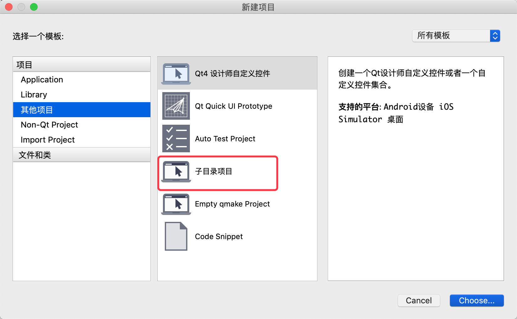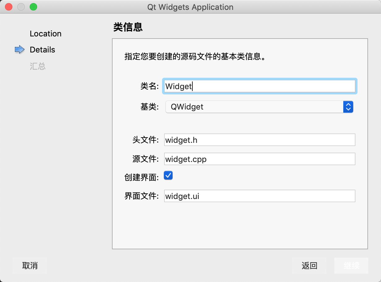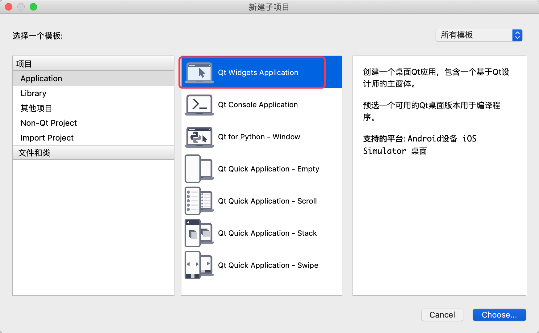 创建好后会提示创建一个子项目,这里直接创建一个最简单的widget主工程项目,并命名为MainWindow。