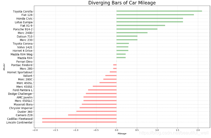 1、根据单个指标查看项目的变化情况,并可视化此差异的顺序和数量,那么发散条是一个很好的工具。它有助于快速区分数据中组的性能,并且非常直观,并且可以立即传达这一点