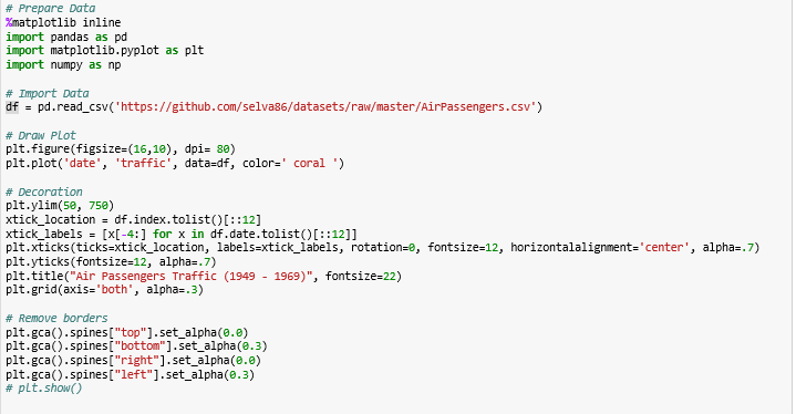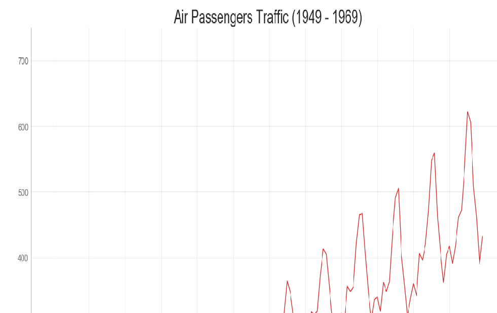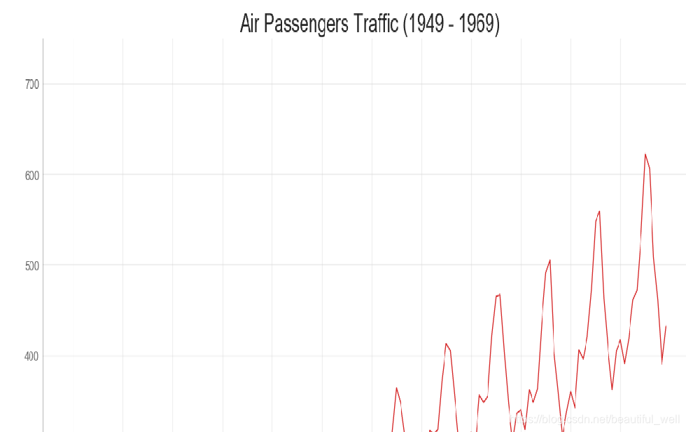 时间序列图用于显示给定度量随时间变化的方式。在这里,您可以看到1949年至1969年间航空客运量的变化情况。