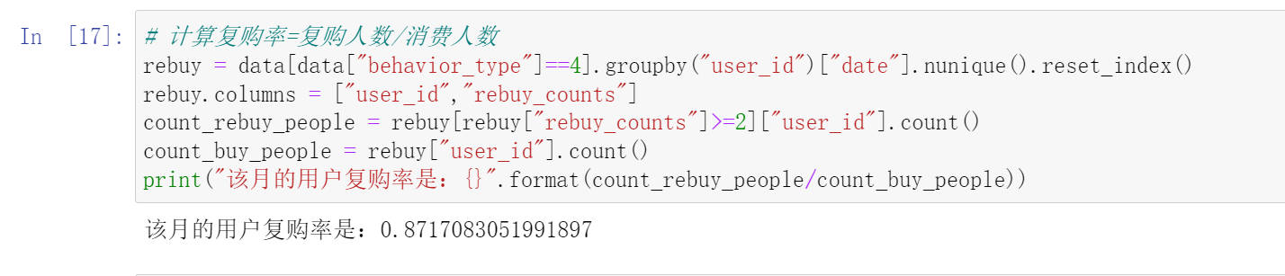 定义复购行为:一个月内两天以上有购买行为,一天多次不算。