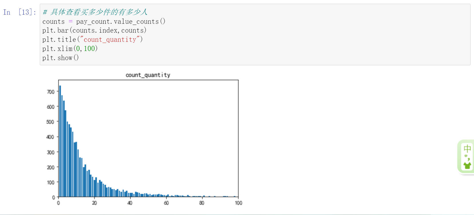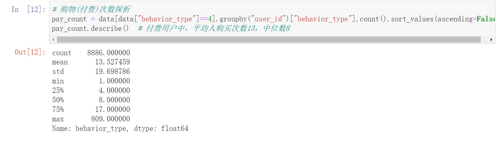 - 付费用户该月平均购物次数 13.5次,最高809次购物,中位数是8次。