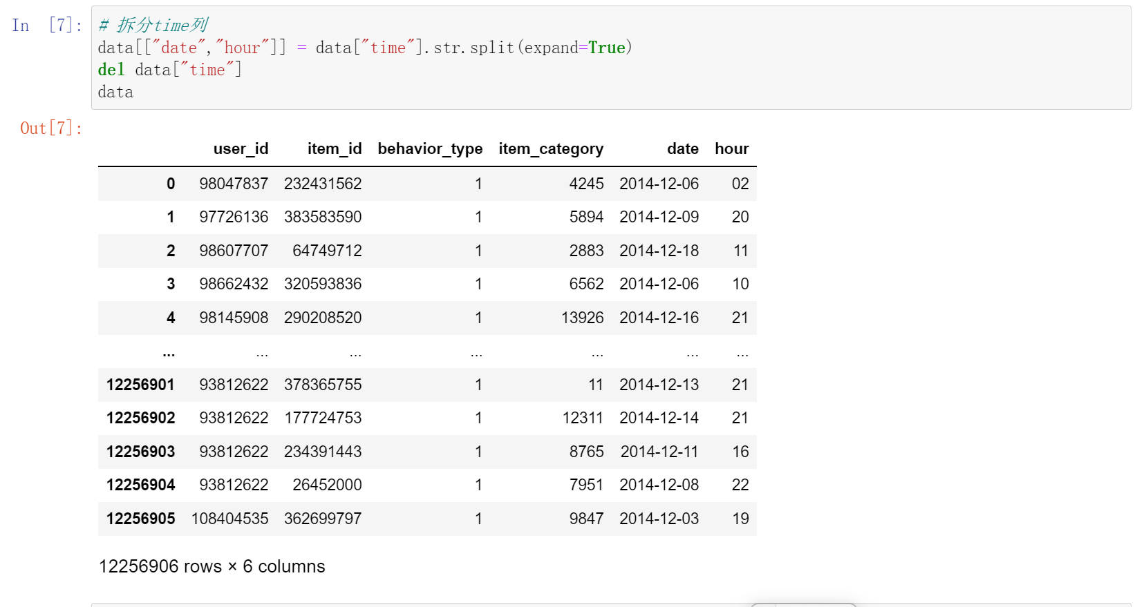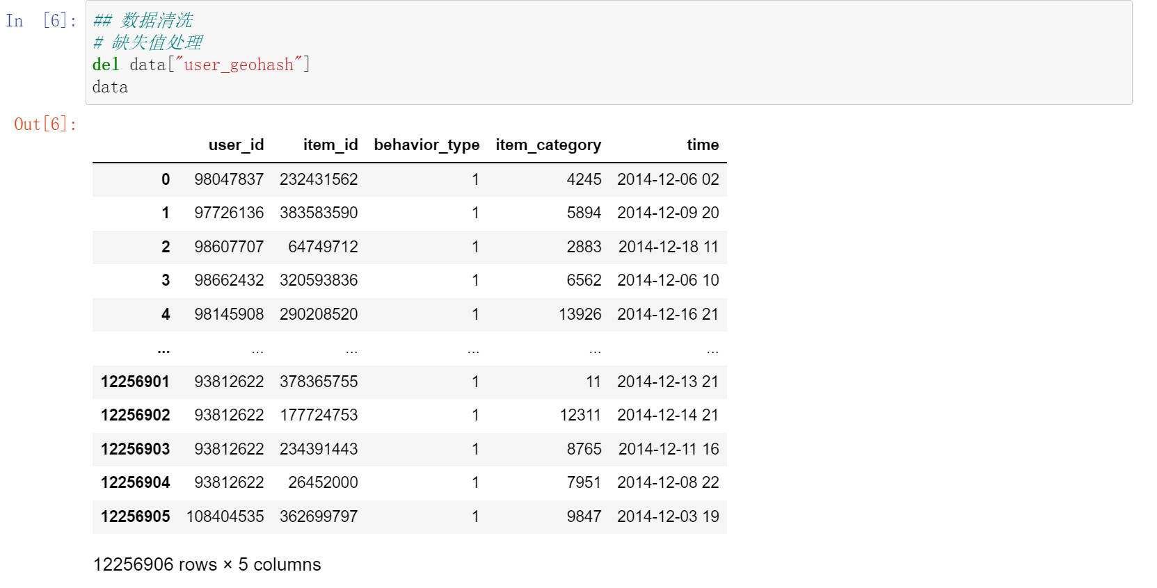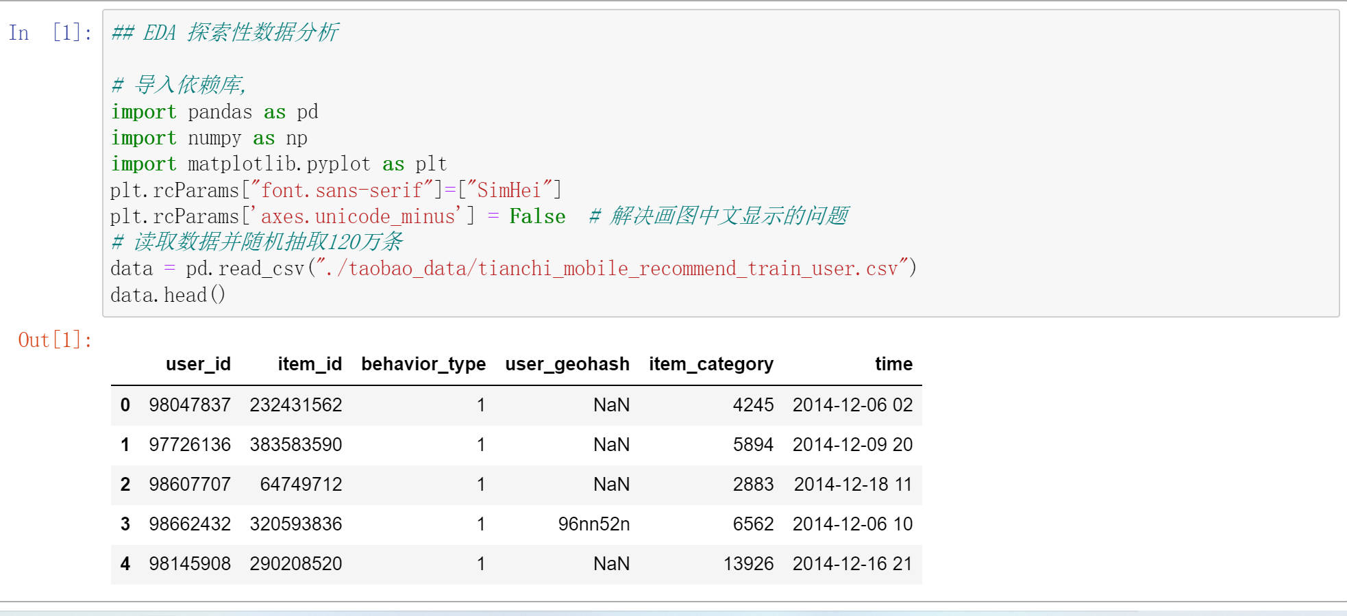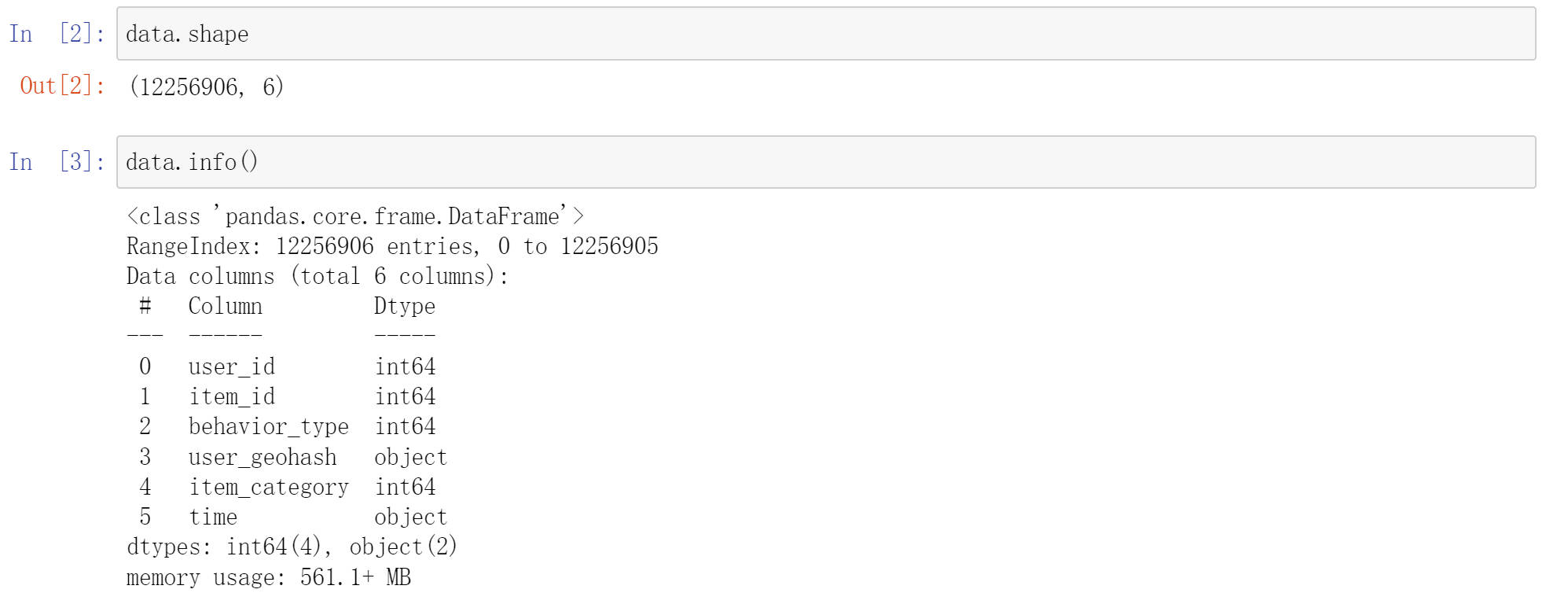 4.2.1数据集共有1200+万条左右数据,数据为淘宝APP2014年11月18日至2014年12月18日的用户行为数据,共计6列字段,列字段分别是: