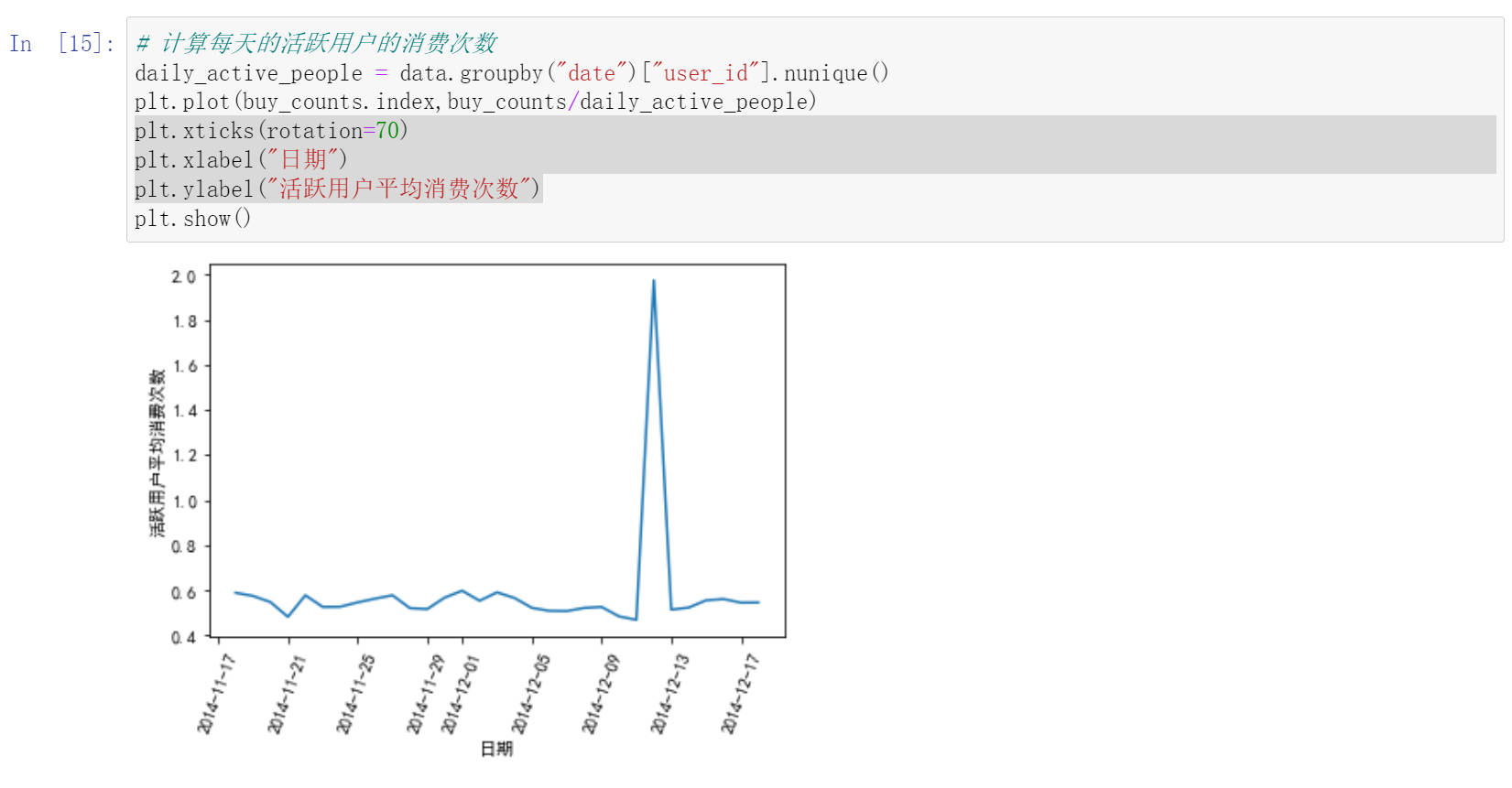 上图显示,淘宝活跃用户(有过操作行为的用户)平均每天消费次数比较低,在0.5次左右,双十二期间达到最高值,有2.0左右。