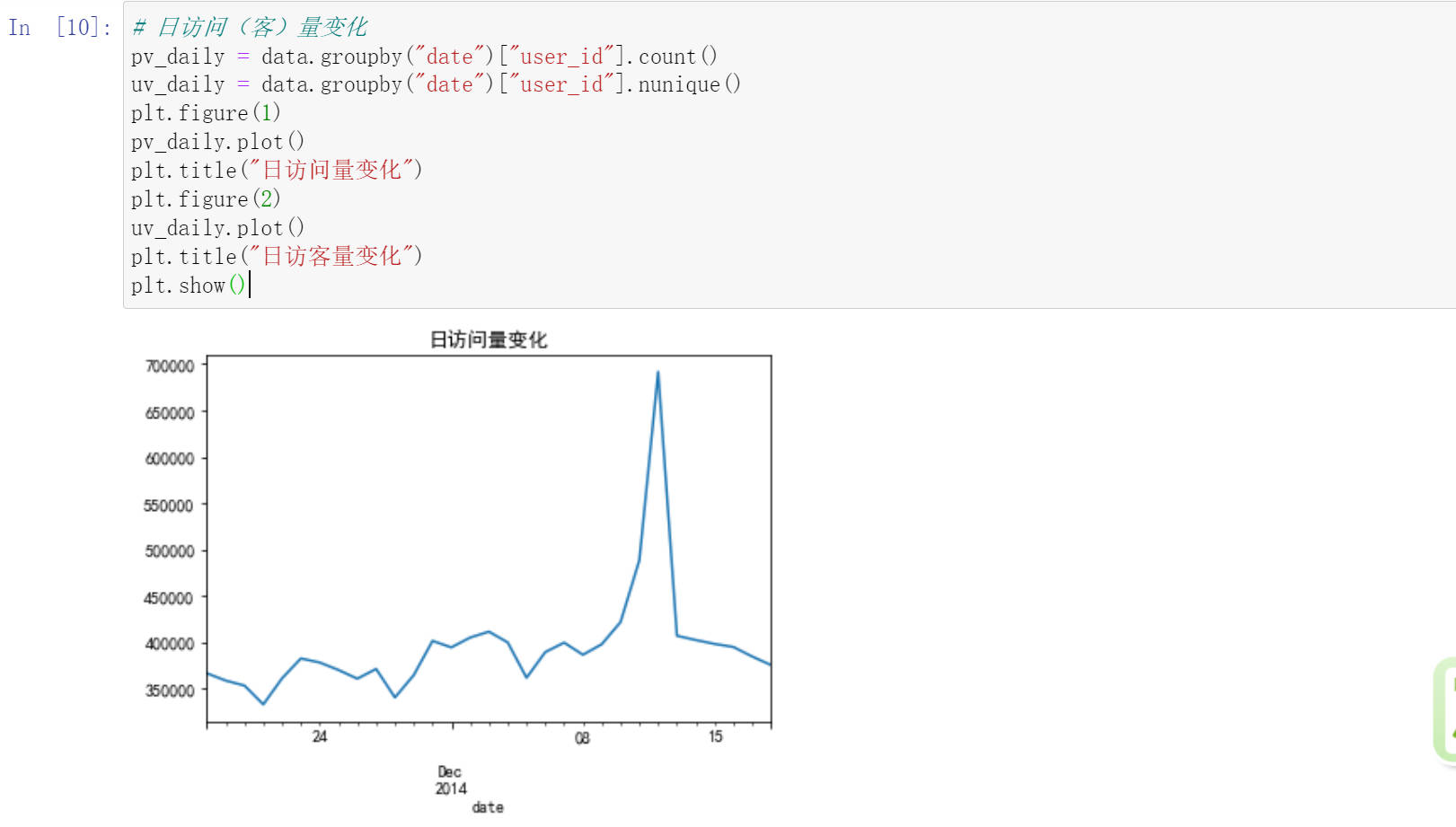 - 同时,因为数据集总人数大约是10000人左右,因此,通过nv值可以分析出双十二期间淘宝用户的日活跃大概是45%浮动。