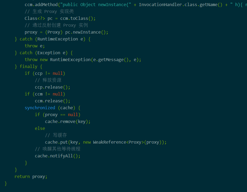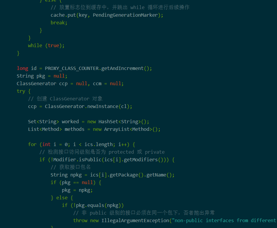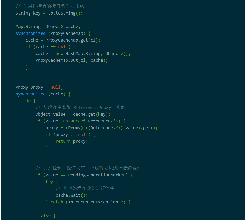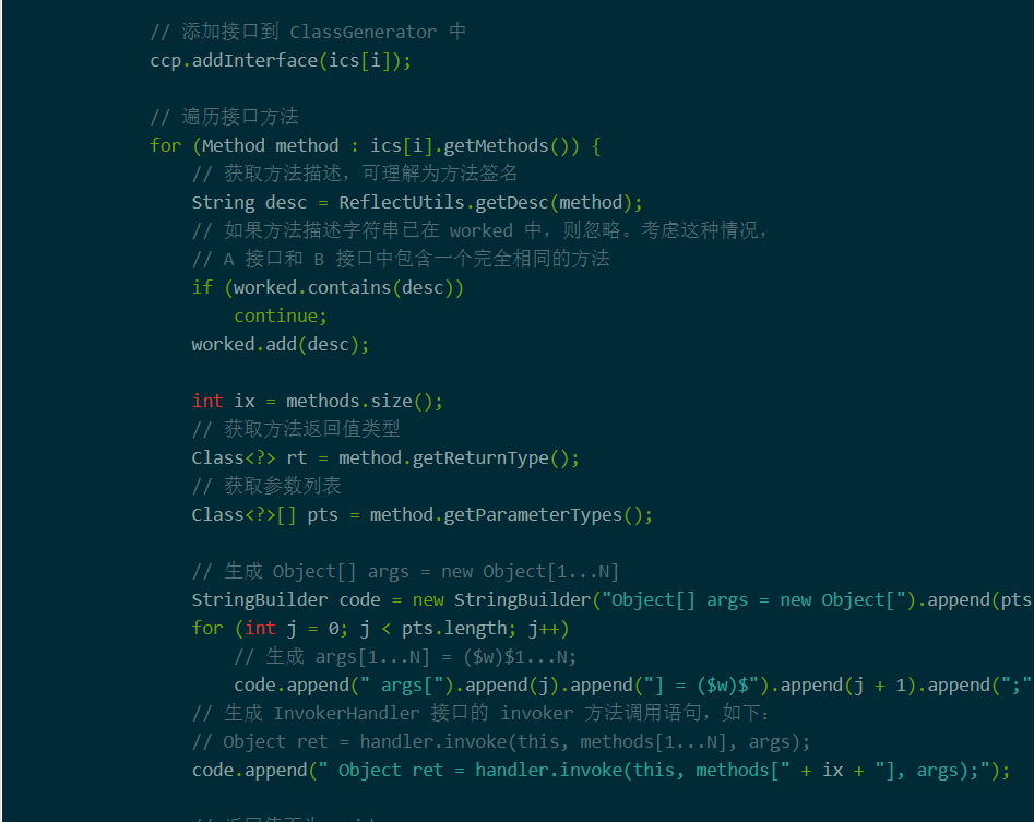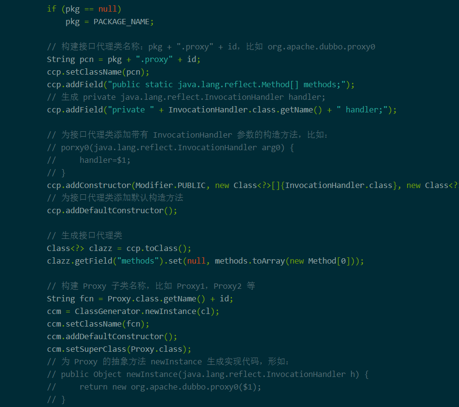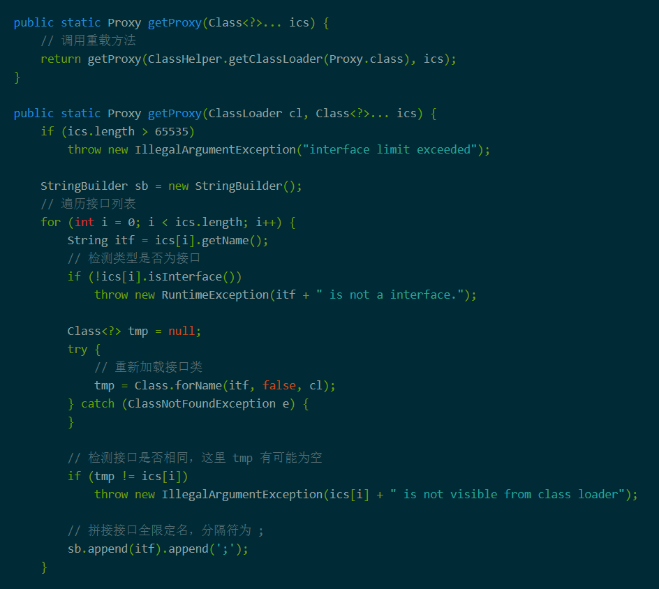 上面代码并不多,首先是通过 Proxy 的 getProxy 方法获取 Proxy 子类,然后创建 InvokerInvocationHandler 对象,并将该对象传给 newInstance 生成 Proxy 实例。InvokerInvocationHandler 实现 JDK 的 InvocationHandler 接口,具体的用途是拦截接口类调用。该类逻辑比较简单,这里就不分析了。下面我们重点关注一下 Proxy 的 getProxy 方法,如下。