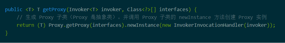 Invoker 创建完毕后,接下来要做的事情是为服务接口生成代理对象。有了代理对象,即可进行远程调用。代理对象生成的入口方法为 ProxyFactory 的 getProxy,接下来进行分析。