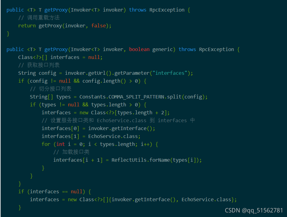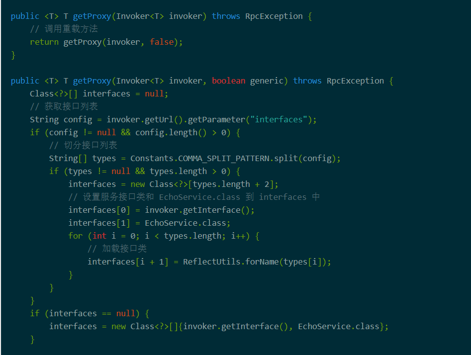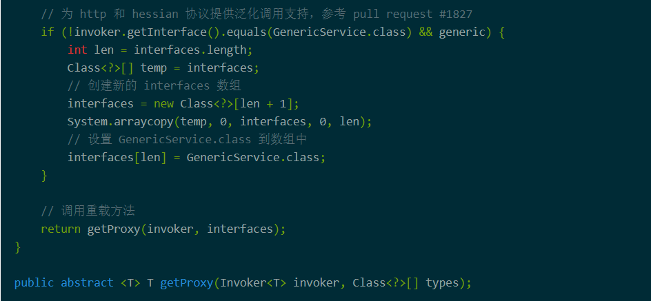 如上,上面大段代码都是用来获取 interfaces 数组的,我们继续往下看。getProxy(Invoker, Class<?>[]) 这个方法是一个抽象方法,下面我们到 JavassistProxyFactory 类中看一下该方法的实现代码。