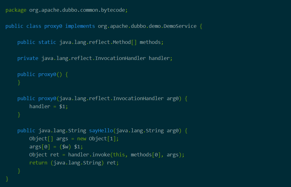 上面代码比较复杂,我们写了大量的注释。大家在阅读这段代码时,要搞清楚 ccp 和 ccm 的用途,不然会被搞晕。ccp 用于为服务接口生成代理类,比如我们有一个 DemoService 接口,这个接口代理类就是由 ccp 生成的。ccm 则是用于为 org.apache.dubbo.common.bytecode.Proxy 抽象类生成子类,主要是实现 Proxy 类的抽象方法。下面以 org.apache.dubbo.demo.DemoService 这个接口为例,来看一下该接口代理类代码大致是怎样的(忽略 EchoService 接口)。
