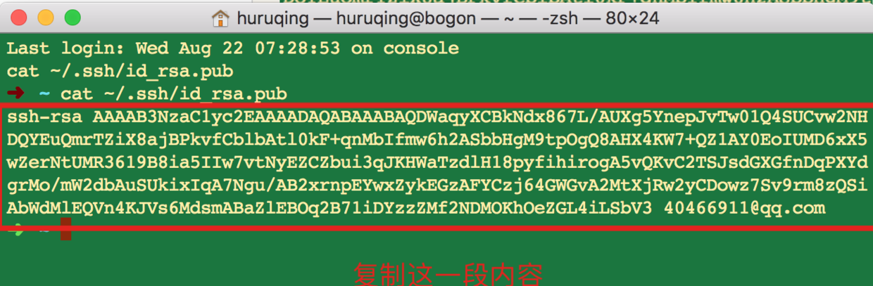 - 输入 cat ~/.ssh/id_rsa.pub 查看你的 public key(公钥),结果如下: