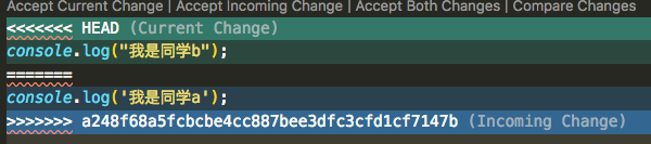 - ======到>>>>>>> a248f68a5fcbcbe4cc887bee3dfc3cfd1cf7147b 的代码是同学 a 的代码,括号的 Incoming Change 的意思是从外面来的修改,a248f68a5fcbcbe4cc887bee3dfc3cfd1cf7147b 是仓库是冲突的版本号,你可以通过 git log 看到详细的信息.