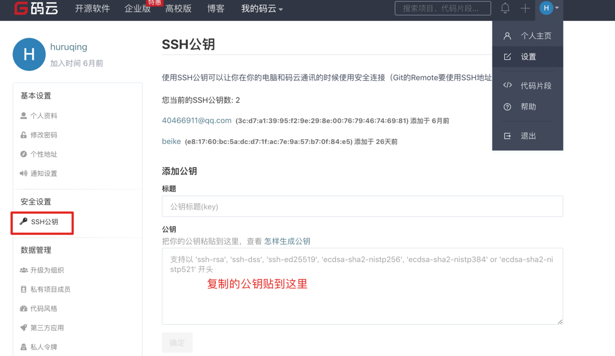 (2) 给码云配置公钥#