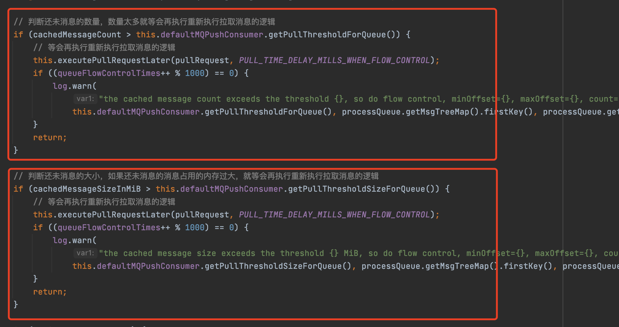 判断还未消费消息的大小,如果还未消息的消息占用的内存过大,就等会再执行重新执行拉取消息的逻辑