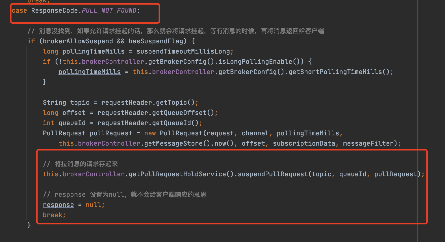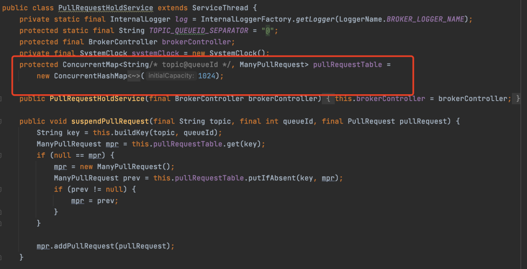 拉取不到消息时,会调用PullRequestHoldService的suspendPullRequest方法讲请求存储起来。PullRequestHoldService是用来存储拉取请求的类。