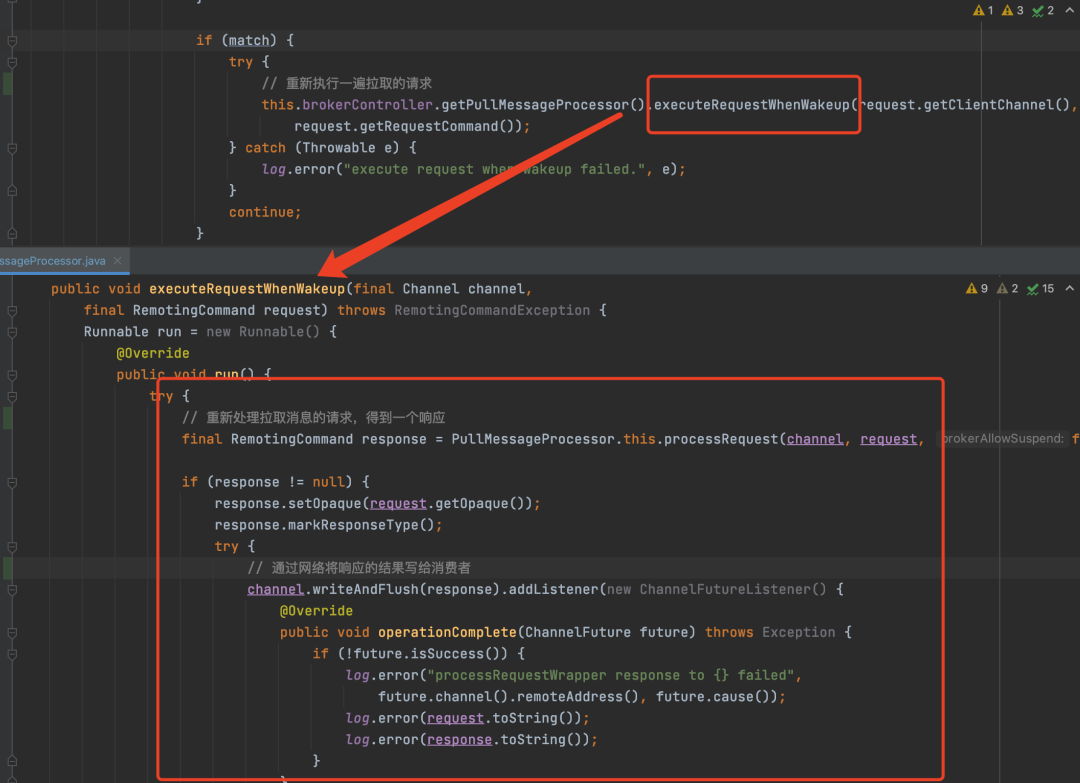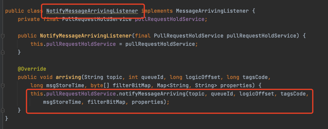 当生产者发送的消息达到MQ的时候,MQ会回调NotifyMessageArrivingListener的arriving方法,之后就会调用PullRequestHoldService的notifyMessageArriving方法,MQ会重新处理拉取消息的逻辑,此时就能找到最新来的那条消息,从而将最新的消息通过网络返回给消费者。