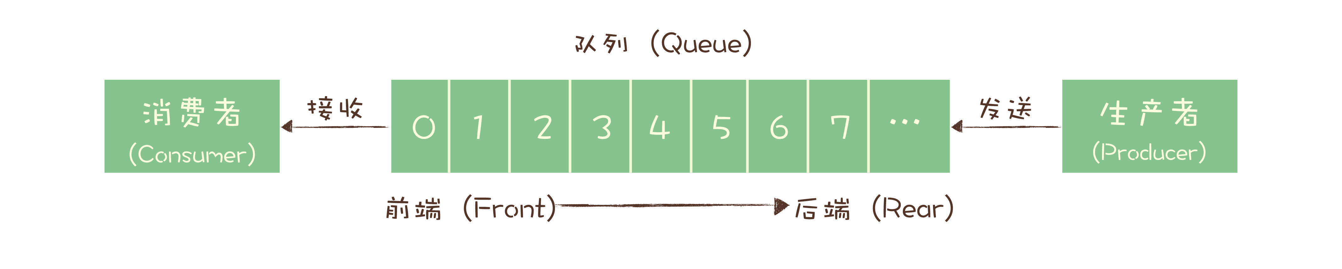 队列是先进先出(FIFO, First-In-First-Out)的线性表(Linear List)。在具体应用中通常用链表或者数组来实现。队列只允许在后端(称为 rear)进行插入操作,在前端(称为 front)进行删除操作。
