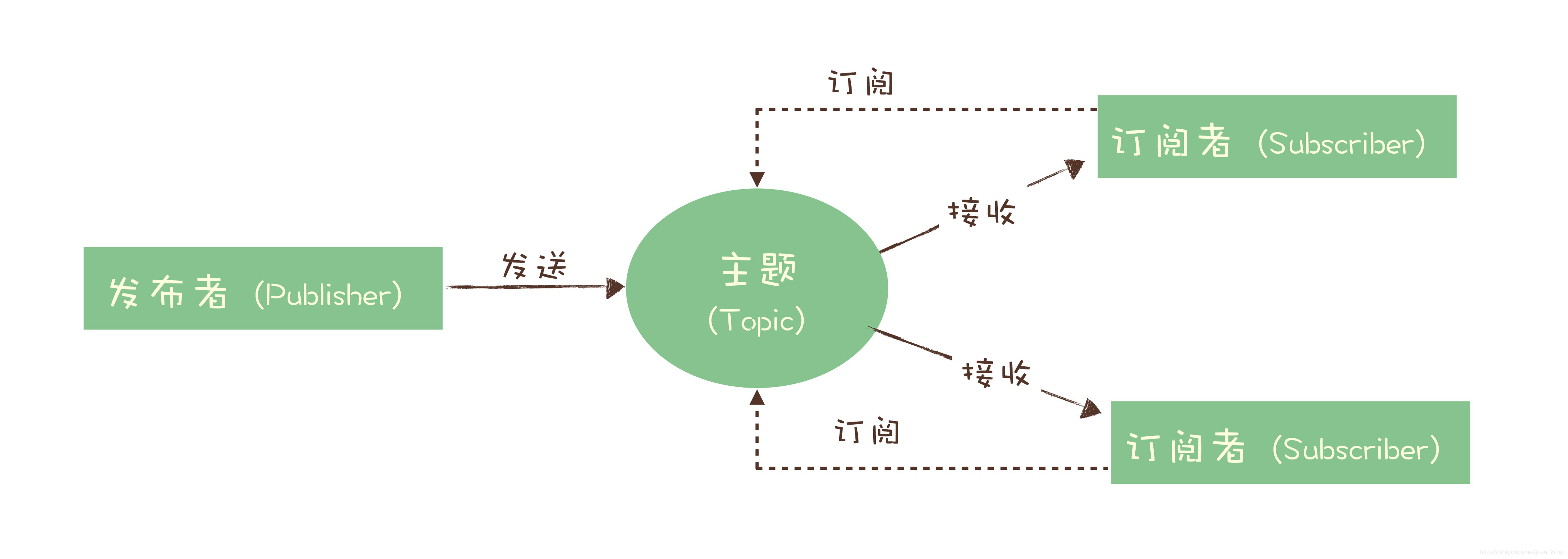 在发布 - 订阅模型中,消息的发送方称为发布者(Publisher),消息的接收方称为订阅者(Subscriber),服务端存放消息的容器称为主题(Topic)。发布者将消息发送到主题中,订阅者在接收消息之前需要先“订阅主题”。“订阅”在这里既是一个动作,同时还可以认为是主题在消费时的一个逻辑副本,每份订阅中,订阅者都可以接收到主题的所有消息。